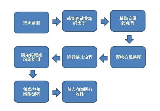 服務包括 前終止支持 (Pre-termination Support) - 輔導直屬經理們如何處理整個裁員行動得以順利完成 發布終端支持 (Post Termination Support) - 緩解過渡過程,並為被解員工提供現場輔導 再就業支援 (Outplacement Support) - 職業生涯規劃與如何執行職場走向計劃 支持倖存者 (Support for survivors) - 維持和提高裁員後倖存員工之間的士氣